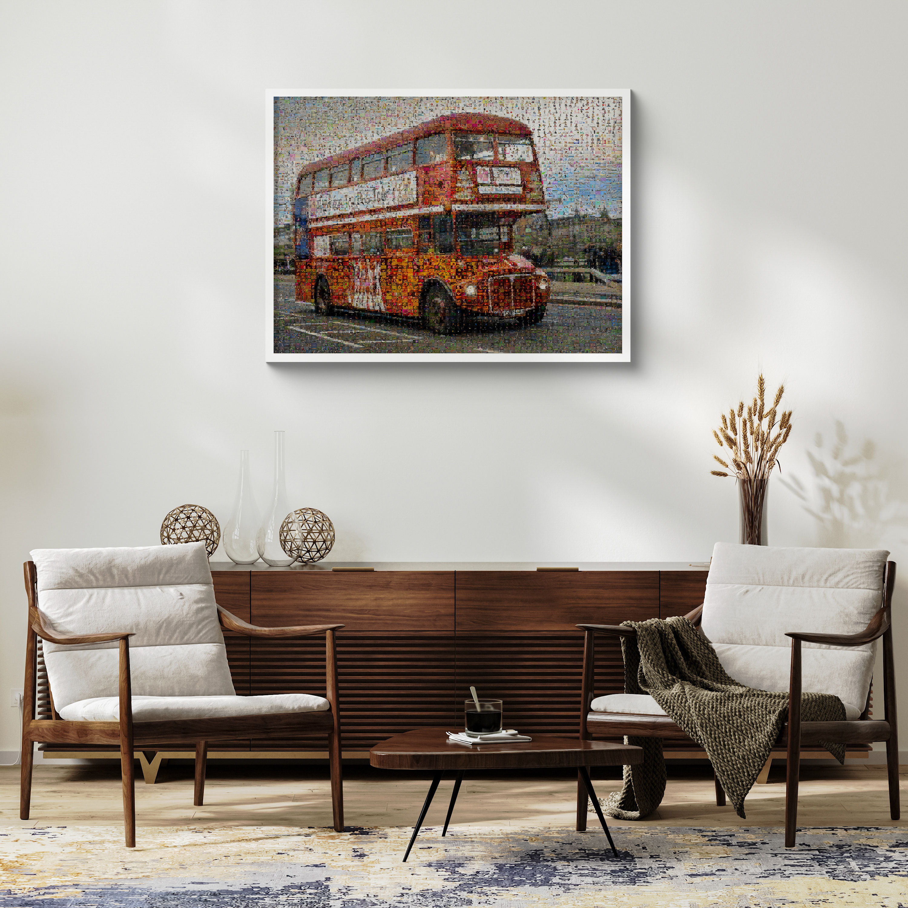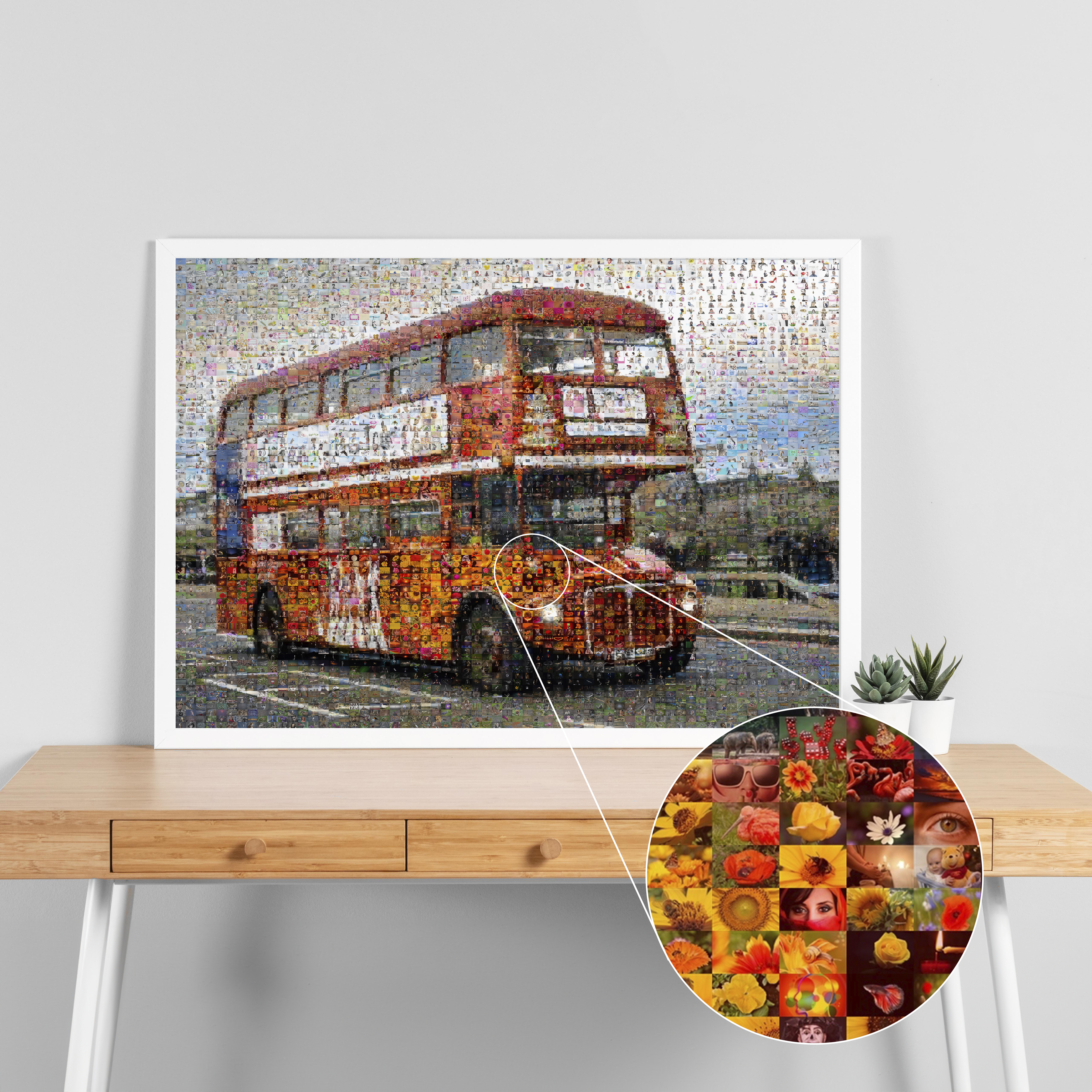 Fotomosaico único de un autobús londinense, ideal para recordar viajes con amigos y familiares.