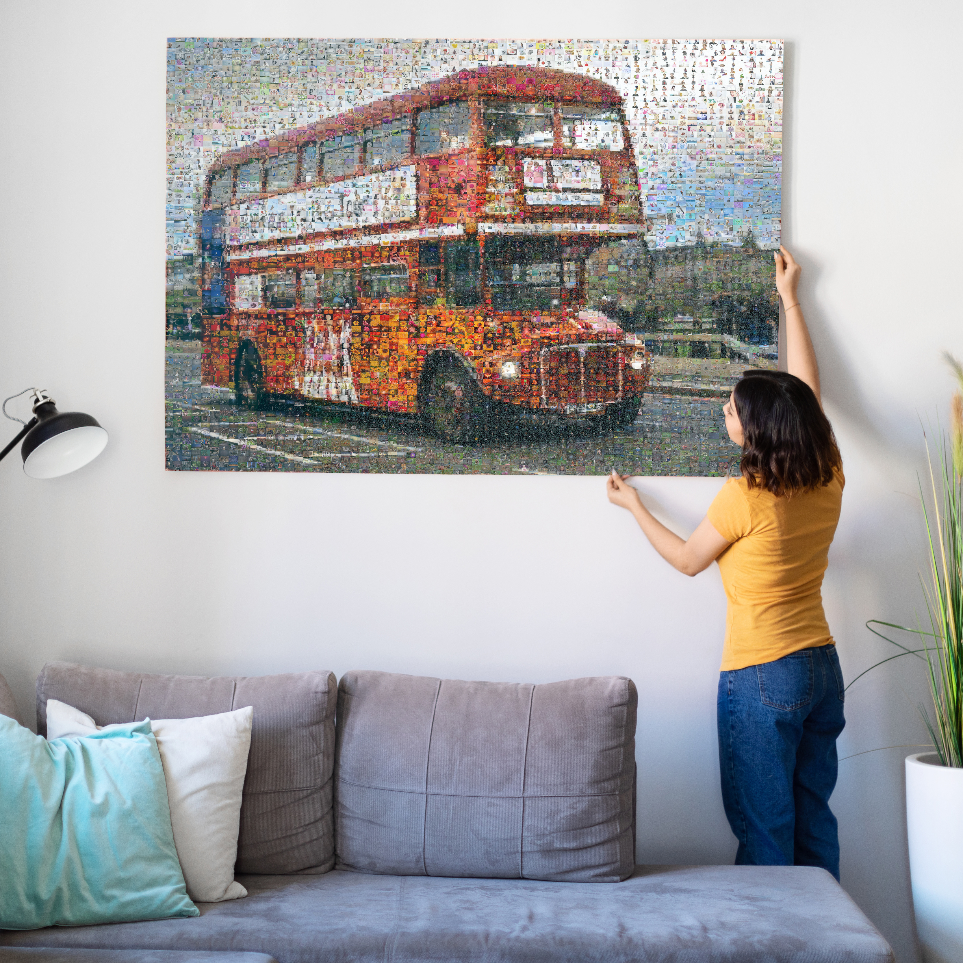 Convierte tus fotos favoritas en una obra de arte única. Nuestro fotomosaico del icónico autobús de dos pisos de Londres es perfecto para los amantes de los viajes, familias y amigos que desean capturar recuerdos de sus aventuras. Ideal para decorar tu hogar o regalar un detalle original y personalizable.