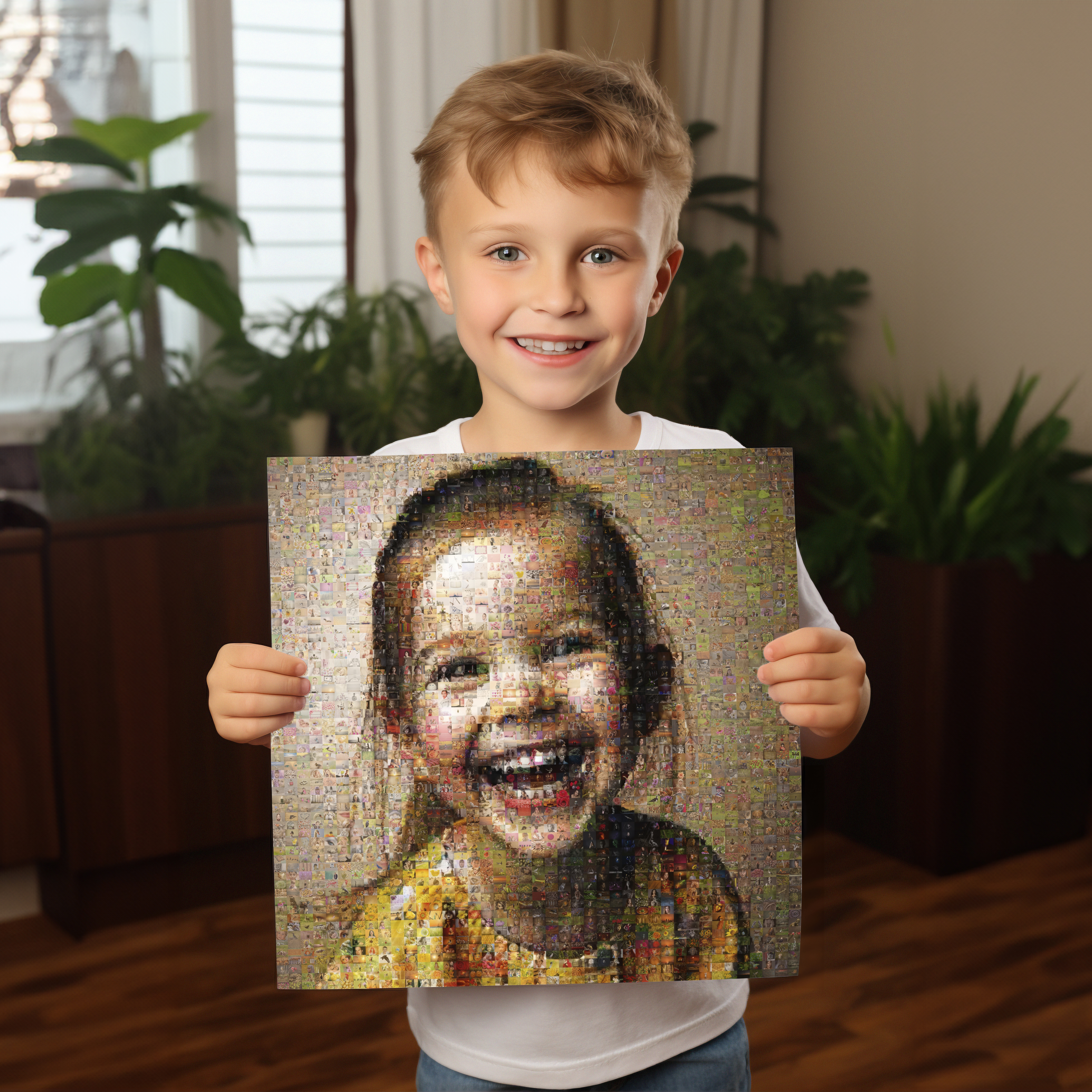 Descubre la magia de crear un fotomosaico único a partir de tus fotos favoritas. Imagina un mosaico diseñado con numerosas fotos de tus hijos, reuniendo cada imagen para formar una gran imagen del niño. Este producto es ideal para padres, abuelos, o como regalo especial de amigos y familiares. Perfecto para añadir un detalle decorativo en el hogar o para sorprender en ocasiones como cumpleaños, bautizos o aniversarios. Personaliza cada detalle a tu gusto.