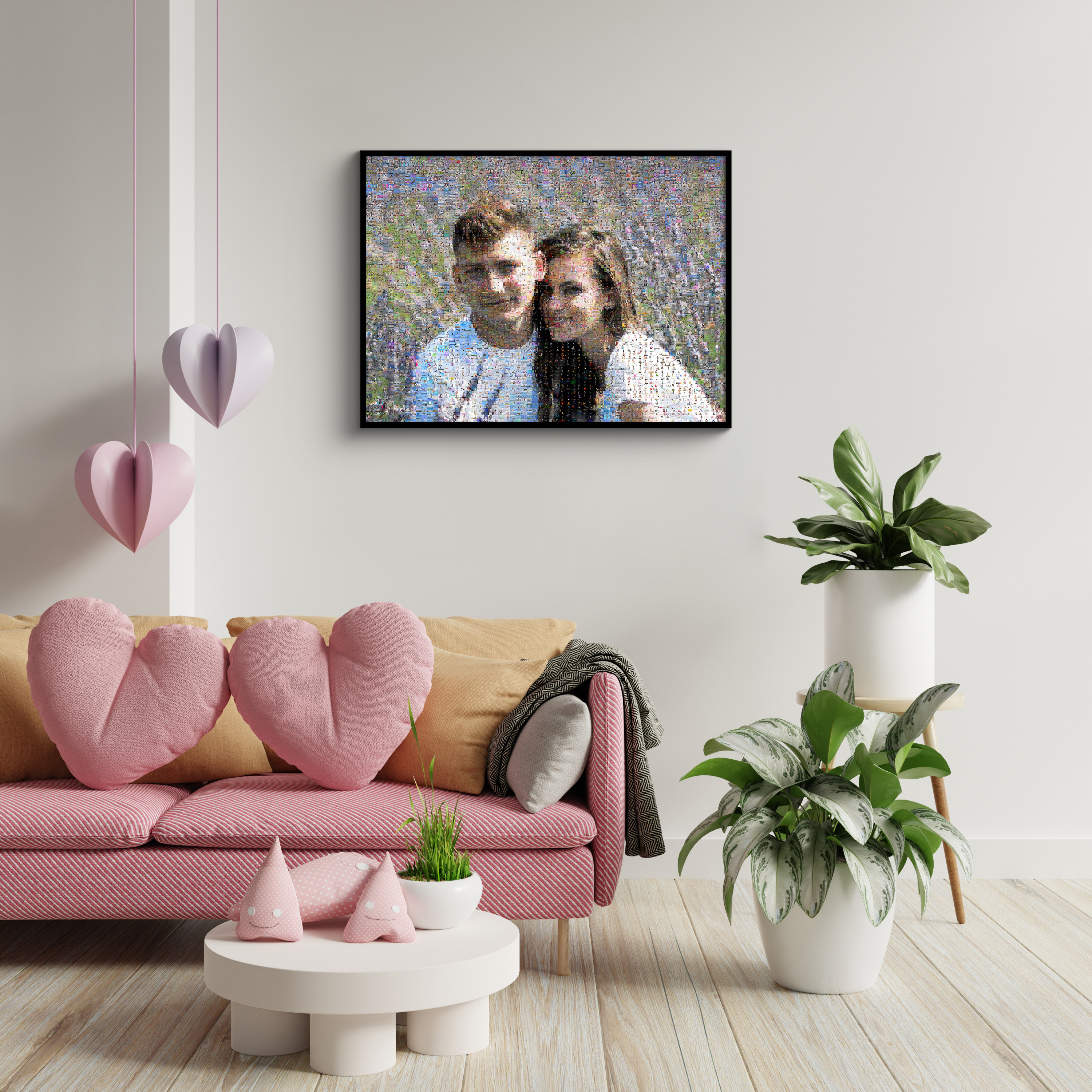 Transforma tus recuerdos más preciados en un arte único con nuestro fotomosaico personalizado. Imagina tener un bello retrato de pareja, compuesto por cientos de tus mejores momentos juntos, ideal para celebrar aniversarios, bodas o San Valentín. Este detalle se convertirá en el centro de atención de tu hogar.